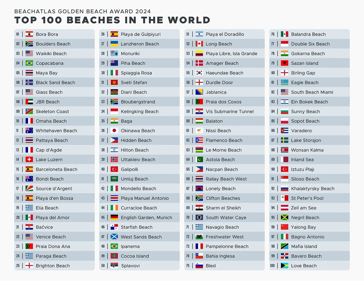Ειδικότερα, η φημισμένη παραλία Ελιά, στη Μύκονο, βρίσκεται στο Top 20 της λίστας και συγκεκριμένα στη 19η θέση και λίγες θέσεις πιο κάτω συναντάται μία ακόμη παραλία του δημοφιλούς νησιού, η Παράγκα, στην 24η θέση. Ενώ, η τρίτη ελληνική παραλία που περιλαμβάνεται στη λίστα είναι το πολυφωτογραφημένο Ναυάγιο, στη Ζάκυνθο, η οποία βρίσκεται στην 71η θέση.